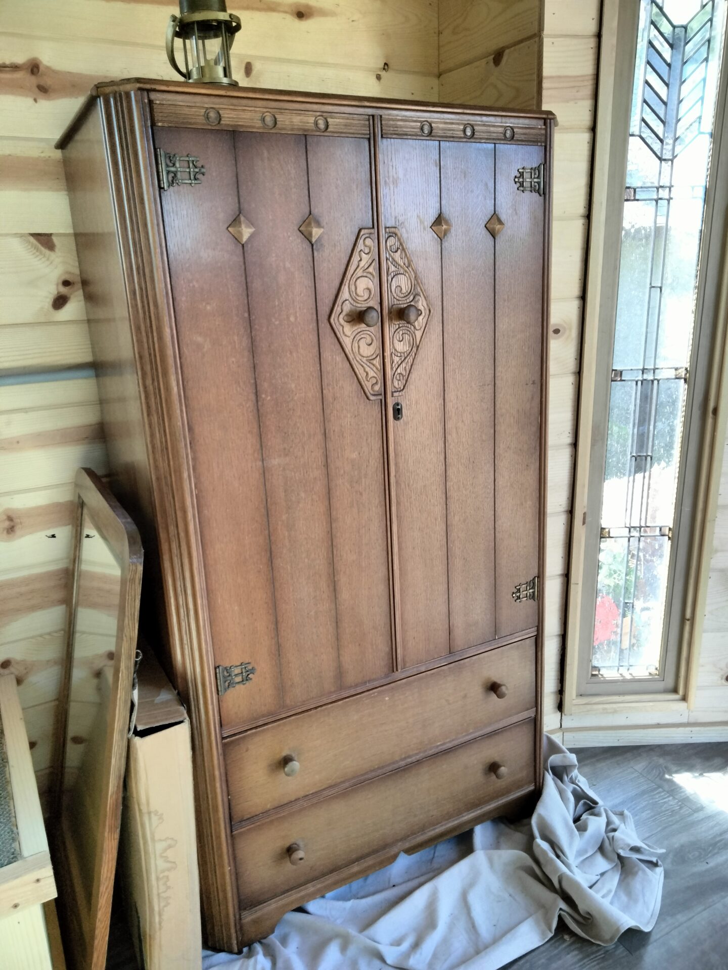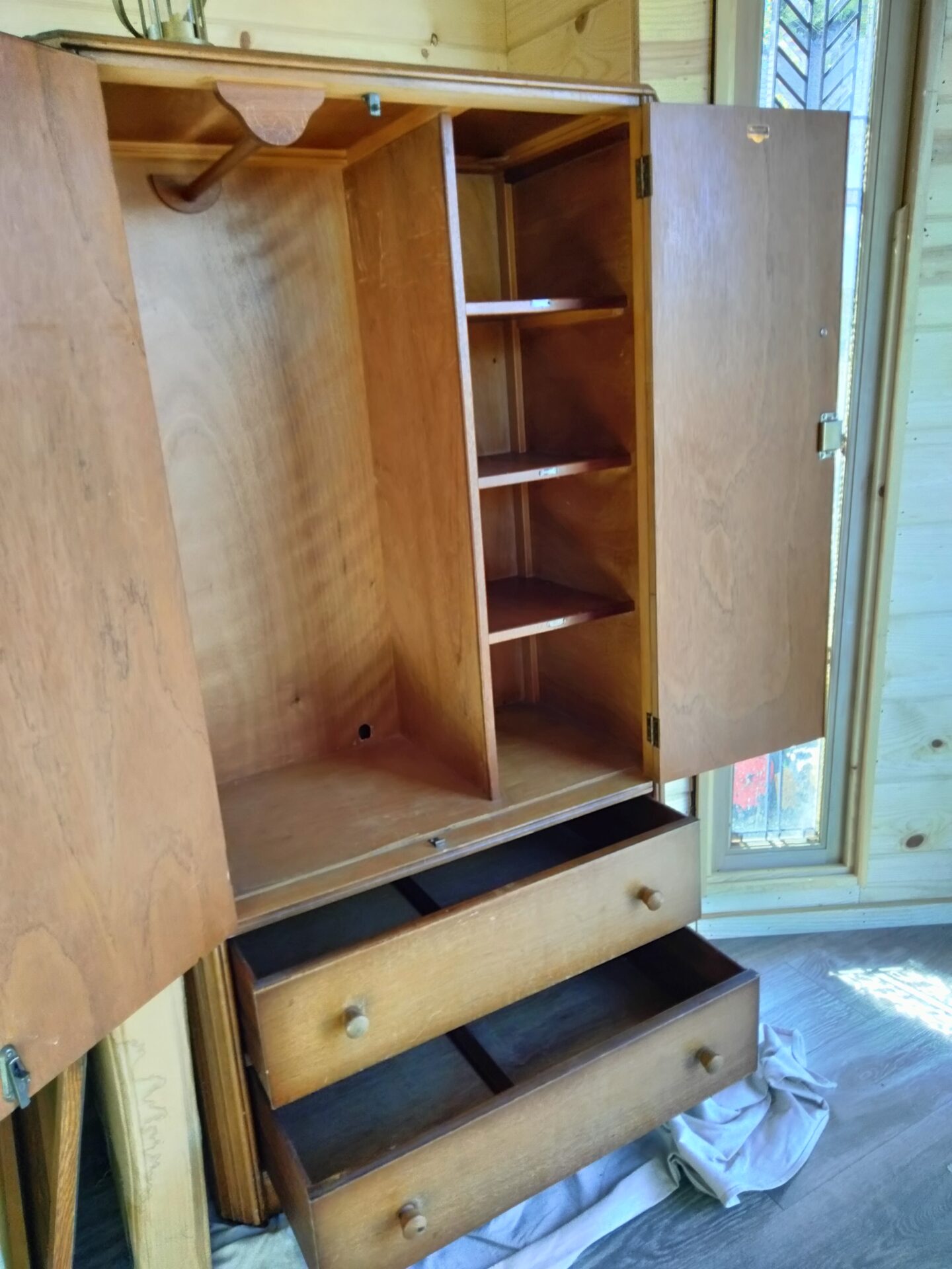 Vintage Armoire. 18″ deep x 33″ wide x 60″ tall. Clothing bar and cubbies. Two drawers.